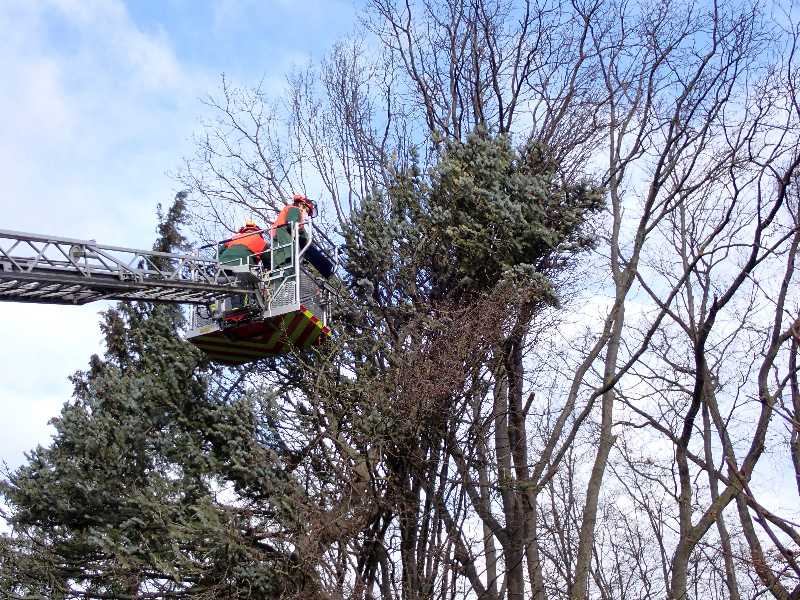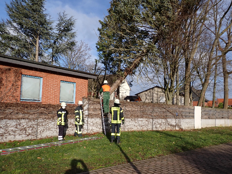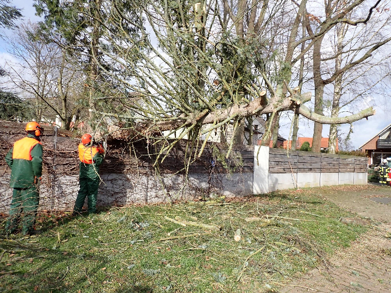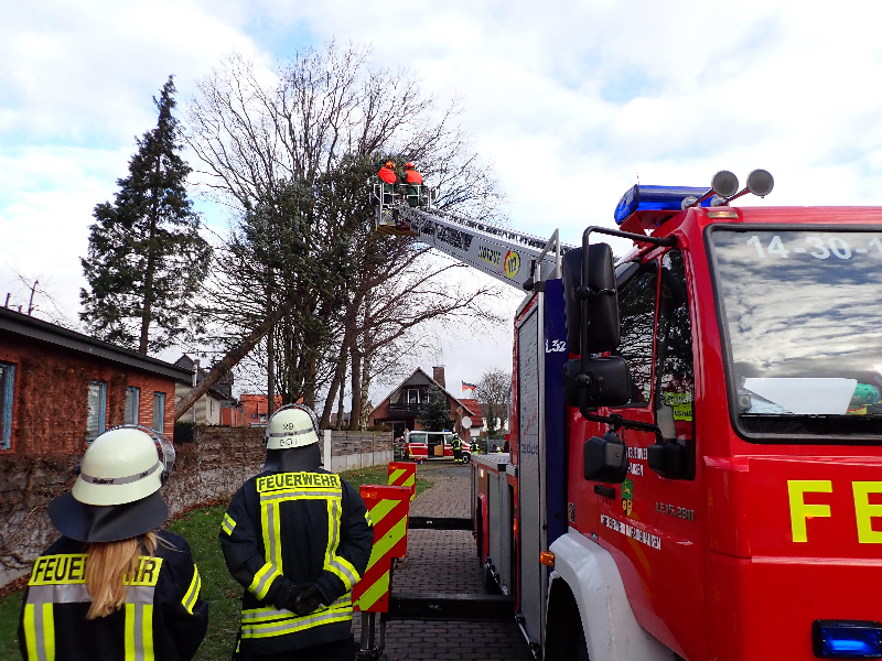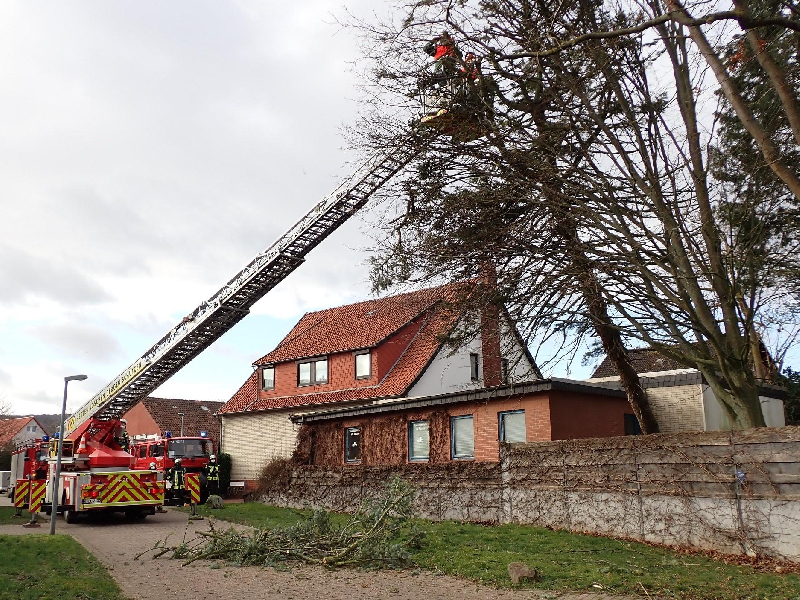Es drohte ein Baum auf die Stormstraße zu fallen. Er wurde durch einen zweiten Baum gestoppt. Die Drehleiter aus Barsinghausen wurde nachgefordert. Der Baum musste langsam Stück für Stück zersägt werden. Der Zaun darunter wurde bei den Arbeiten durch den Baum beschädigt. Im Einsatz bis 13:00 Uhr waren 30 Feuerwehrleute mit 6 Fahrzeugen sowie Polizei.
