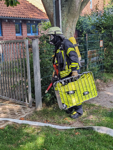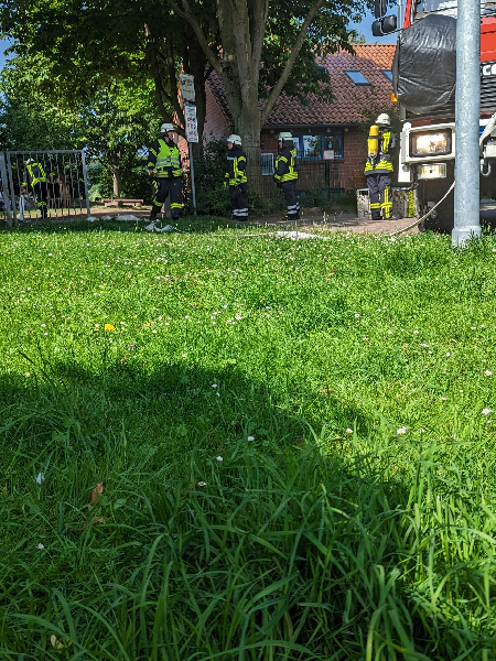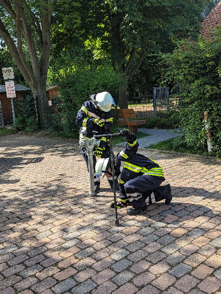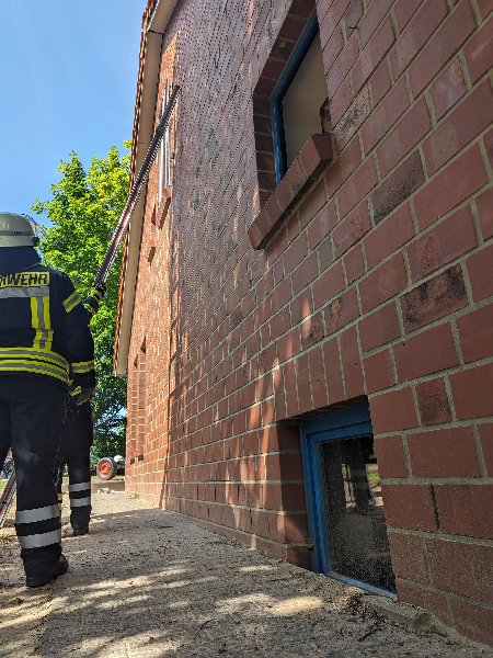 Im Zuge einer Übung zur Brandschutzerziehung und zum Test der internen Abläufe des Kindergartens Wichtelhausen in der Ellernstraße, wurde eine Rauchentwicklung mittels Nebelmaschine in einem Gruppenraum simuliert. Angenommen wurde, dass sich noch zwei Erzieherinnen im ersten Obergeschoss befanden, welche sich nicht mehr selbstständig in Sicherheit bringen konnten. Eine Person klagte zudem über Schmerzen am Bein und konnte nicht mehr selbstständig laufen. Die Personen wurden durch zwei Trupps unter Atemschutz mittels Tragetuch gerettet und im Anschluss durch den Rettungsdienst der SEG Barsinghausen, der ebenfalls an der Übung teilnahm, betreut. Zeitgleich wurde im Außenbereich eine Steckleiter als sogenannter zweiter Rettungsweg an einem extra dafür vorgesehenen Fluchtfenster in Stellung gebracht.