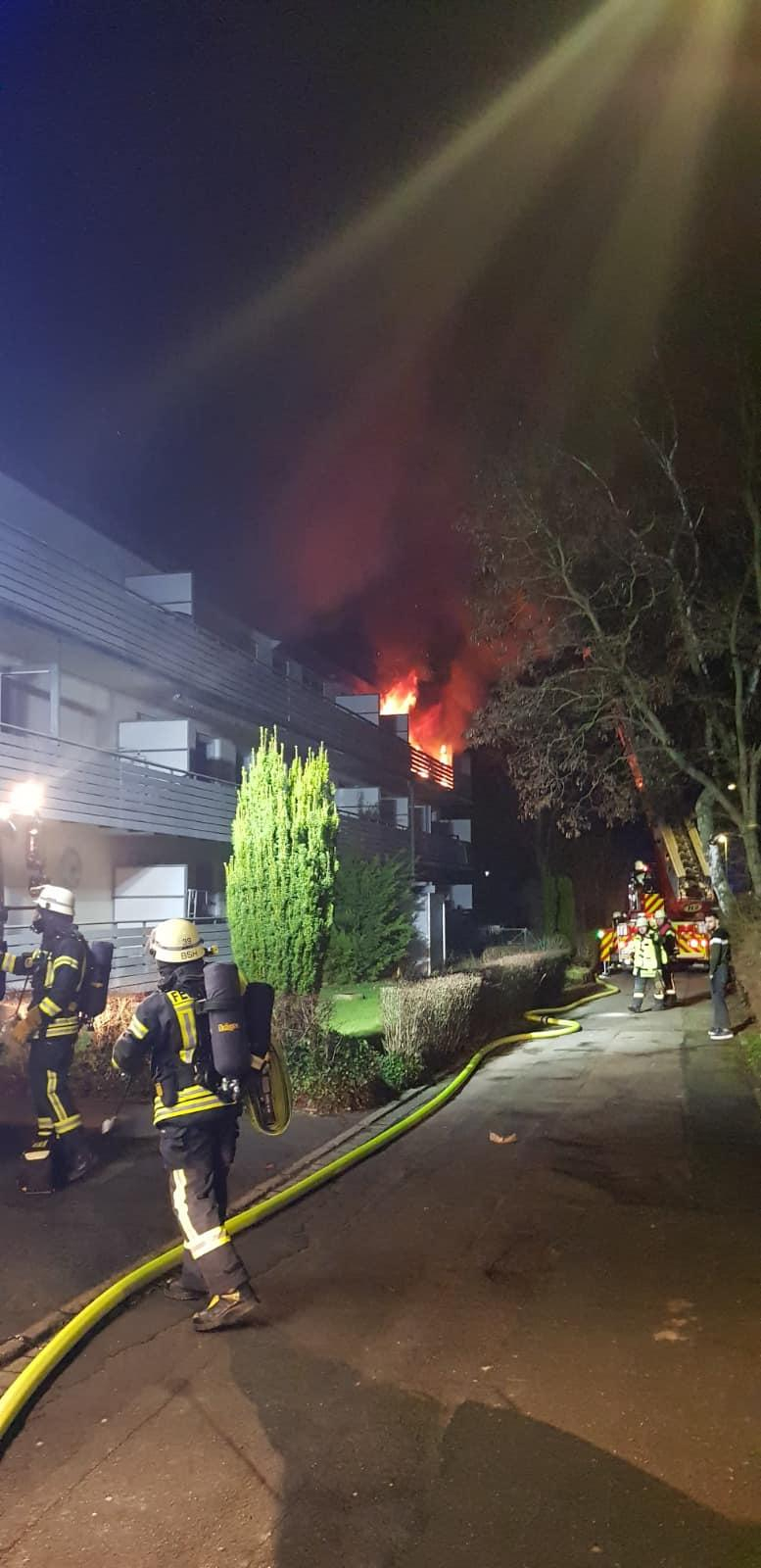 Die Feuerwehr setzte sofort zwei Trupps zur Innenbrandbekämpfung mit zwei C-Rohren ein, zeitgleich wurde die Drehleiter auf der Gebäude-Südseite in Stellung gebracht um mit einem weiteren C-Rohr den Balkon abzulöschen und die Dachfläche vor einem Durchbrennen zu sichern.