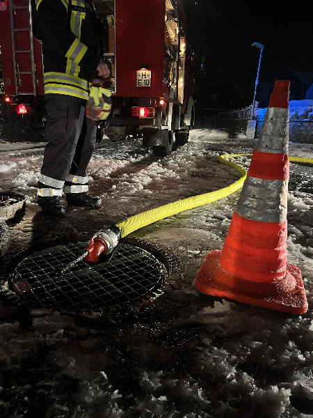 Während weiter nach der Ursache gesucht wurde, wurde das Haus an der Wennigser Straße stromlos geschaltet. Mit Hilfe einer leistungsstarken Wasser-Tauchpumpe wurde das mittlerweile nun fast zwei Meter hochstehende Wasser abgepumpt. Im ersten Haus an der Eickenwiese wurde nach weiterer Erkundung festgestellt, dass im kompletten Keller das Wasser aus den Wänden drückte und auch aus den Steckdosen lief. Sofort wurden die betroffenen Bereiche des Hauses stromlos geschaltet. Im Garten wurde eine Revisionsklappe für ein Entwässerungssystem freigelegt, an dem auch das Drainagesystem des Hauses angeschlossen war. Die Entwässerungsgrube war mehrere Meter tief und führte die Entwässerung eines Bachlaufes. Allerdings stand hier das Wasser rund zwei Meter hoch, und die Fließrichtung des Wassers lies darauf schließen, dass aktuell das Wasser entgegen der eigentlichen Fließrichtung gedrückt wurde. Es wurde dann eine Tragkraftspritze mit Saugschläuchen vorgenommen, um das Wasser in die Kanalisation zu leiten und das Entwässerungssystem zu entlasten. Zeitgleich wurde im zweiten Haus an der Eickenwiese das Wasser im Keller mittels Wassersauger entfernt. Das Wasser stand hier auf der betroffenen Fläche von ca. 40m² etwa 3cm hoch.