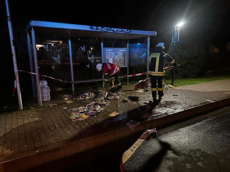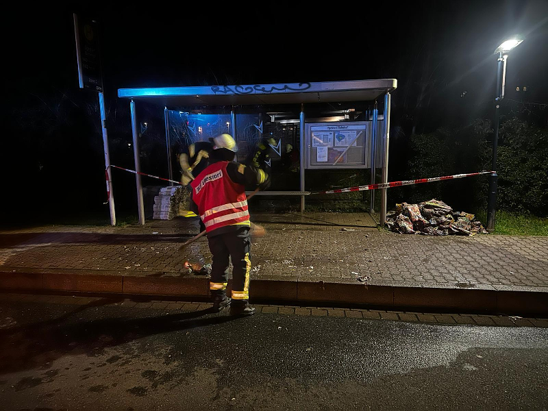 In der Nacht des 08.04.2023 wurde die Ortsfeuerwehr Egestorf zu einem Brandeinsatz zum Bahnhof Egestorf alarmiert. In der Bahnhofstraße werden im Unterstand der Bushaltestelle die Zeitungsbündel für die Verteilung am nächsten Tag gelagert. Die zuerst eingetroffene Polizei hatte bereits die glimmenden Zeitungsstapel von den noch nicht beaufschlagten Zeitungen getrennt. Durch die Feuerwehr wurden zunächst mit Hilfe der Kübelspritze, einem Kleinlöschgerät, die ersten aufkeimenden Flammen gelöscht. Nach einem schnellen Erfolg zeigte sich allerdings, dass sich die Glut bereits tief in die Zeitungsstapel hineingefressen hatte, sodass mit Hilfe der Spitzhacke diese Zeitungsbündel erstmal aufgetrennt und die Zeitungen großflächig auf dem Boden verteilt werden mussten. Dann konnten die Zeitungen mittels B-Schlauch einmal durchnässt werden, um die Glutnester zu löschen. Im weiteren Verlauf wurde dann mittels Schaufel und Dunghaken auch die letzten Zeitungen auseinandergezogen und ggf. noch abgelöscht. Danach wurden die Zeitungen beiseite geschafft, was zum einen sicherstellte, dass wirklich alle Zeitungen abgelöscht waren und damit auch effektiv ein Wiederaufglimmen verhindert werden konnte. Es sorgte aber ebenso dafür, dass der Gehweg wieder für Fußgänger frei zugänglich gemacht wurde.