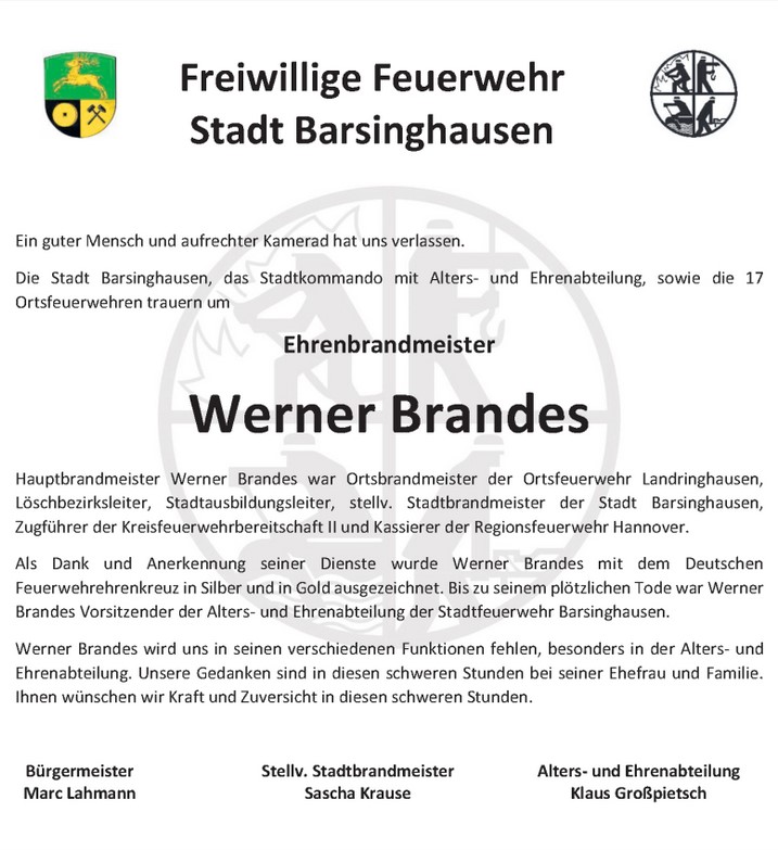 Die Stadt Barsinghausen, das Stadtkommando mit Alters- und Ehrenabteilung, sowie die 17 Ortsfeuerwehren trauern um Ehrenbrandmeister Werner Brandes.