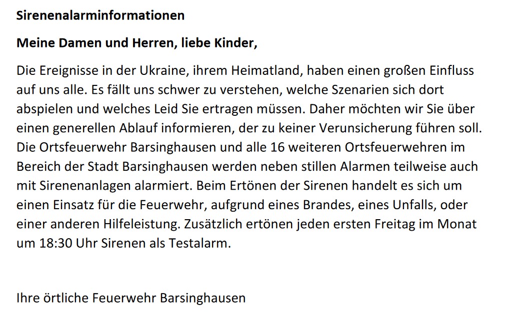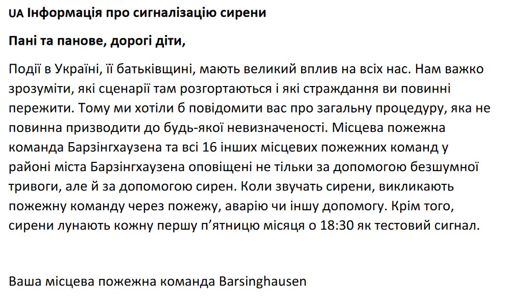 Bitte gebt die folgende Information zur Feuerwehralarmierung an Ukrainerinnen und Ukrainer in Barsinghausen weiter. Diese Info soll helfen, Verunsicherungen durch unsere Sirenenalarmierung zu vermeiden und ist auf ukrainisch und deutsch verfasst. Herzlichen Dank!