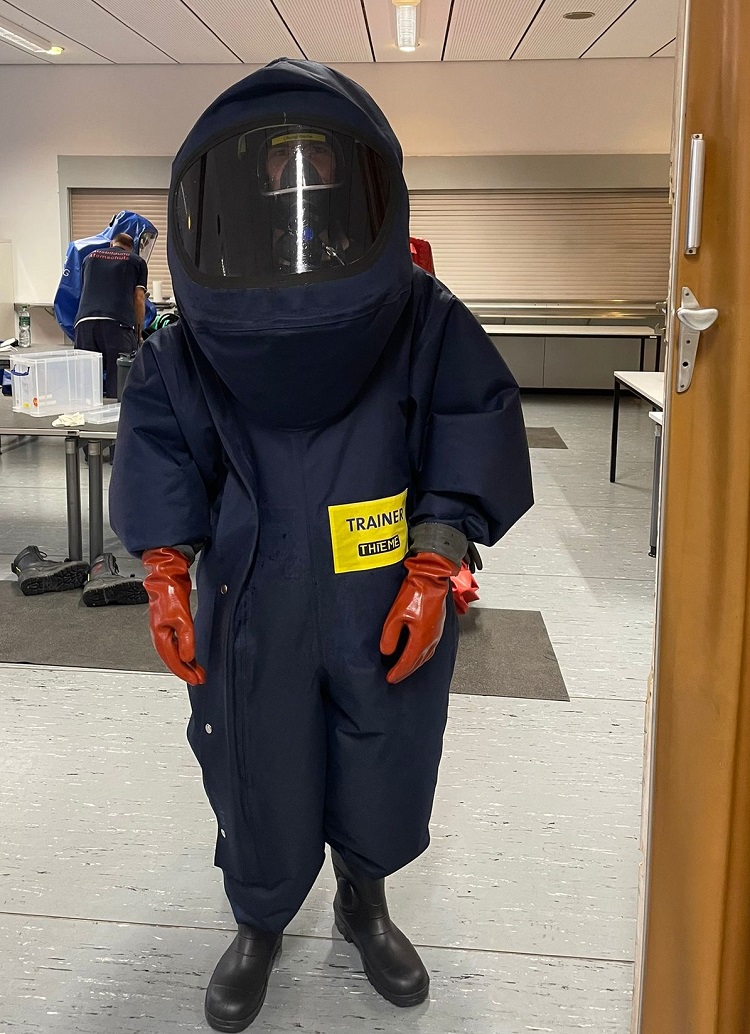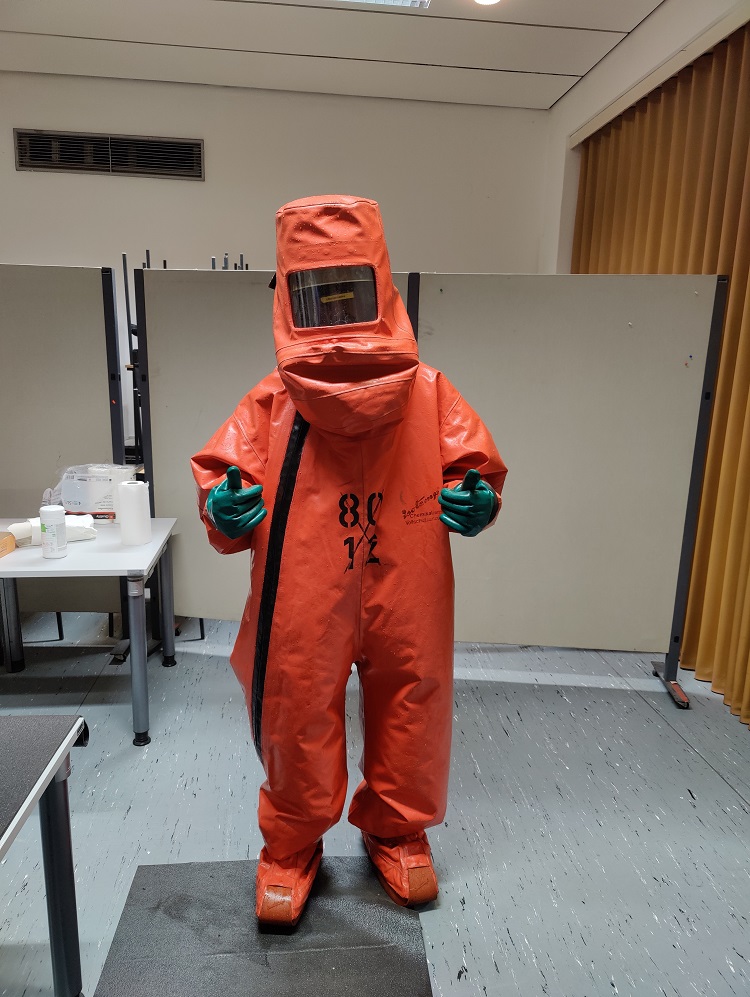 Die Teilnehmer sind bereits voll ausgebildete Atemschutzgeräteträger (AGT) die nun zusätzlich die Fähigkeit erlernen, Gefahren wie z.B. hochgiftige Chemikalien, abzumildern oder sogar ganz zu beseitigen. Neben dem theoretischen Teil, der vorallem auf neue Gefahren und Einsatzgrundsätze unter CSA hinweist, stand der Praxis-Teil im Vordergrund des Seminars. So darf z.B. das richtige Ankleiden nicht unterschätzt werden, geht es hier doch um die Gesundheit der Kammeradinnen und Kameraden. Auch beim Ablegen der Ausrüstung, und der vorher stattfindenden Dekontamination, gibt es Vieles zu beachten. Denn schnell ist man mit seiner Haut an kontaminierte Stellen des Anzuges geraten, was durch sorgsamen Umgang sowie Training zu vermeiden ist. Da der Anzug Luft- und Gasdicht ist, wird unter dem Anzug kompletter Atemschutz getragen. Für den Träger heißt dies am Ende des Tages, dass knapp 30kg zusätzliche Ausrüstung getragen werden. Jeder Einsatz unter CSA ist allein deshalb schon körperliche Schwerstarbeit. Zusätzlich herrschen im Anzug durch dessen Beschaffenheit, aber auch durch die Ausatemluft wie auch die Bewegungen und Belastungen des Trägers, hohe Temperaturen. Hinzukommt die nicht zu unterschätzende psychische Belastung und die eingeschränkte Bewegungsfreiheit. Und genau deshalb ist das Üben, sowie das Gewöhnen an diese außergewöhnliche Belastung so unglaublich wichtig.