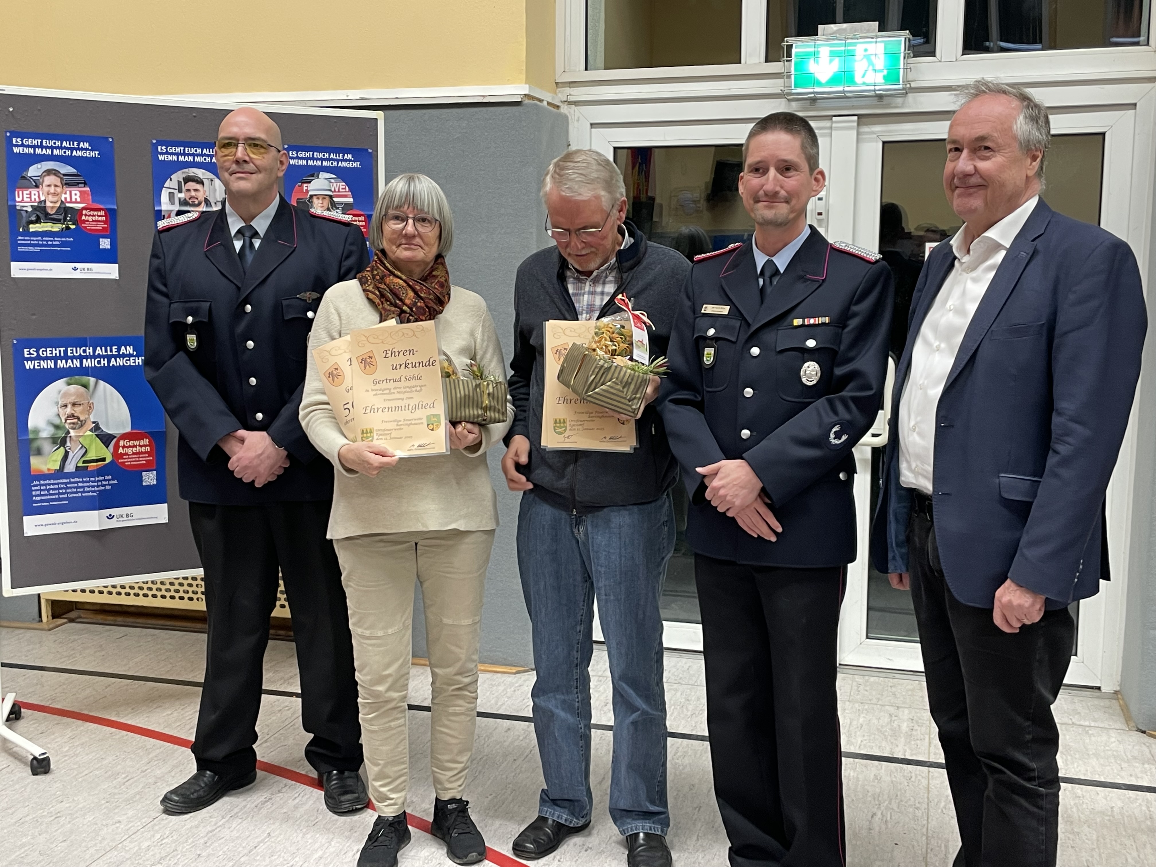 Thomas Wittschurky bedankte sich als Ortsbeauftragter für die vorbildliche Arbeit der Ortsfeuerwehr. Er lobte den vernünftigen Abschluss der Aktion von 2022. Das Thema an sich ist aber leider noch nicht abgeschlossen. Er verwies auf die Kampagne „Keine Gewalt gegen Einsatzkräfte“, bei der Jan-Henrik Büthe eines der Gesichter ist.